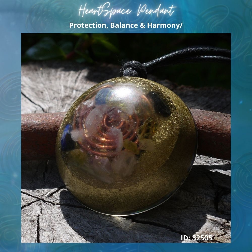 Introducing our Orgonite Heartspace Pendant, a unique and empowering accessory designed to fortify, strengthen, and smooth your aura. Crafted with care and precision, each pendant possesses its own distinct personality, just like you, emitting a vibe and signature that is entirely one-of-a-kind. Created using a specialized Orgonite matrix developed by the talented artisan Amanda, this pendant works harmoniously to enhance your Auric Field. The heartspace A Manda coil, encased in clear resin, holds a powerful combination of crystals including Kyanite, Peridot, Amethyst, Citrine, Selenite, Rose Quartz, Clear Quartz, Smokey Quartz, Garnet, Labradorite, and Jet. These crystals are carefully chosen for their unique properties and benefits, creating a synergistic blend that promotes balance, positivity, and overall well-being.