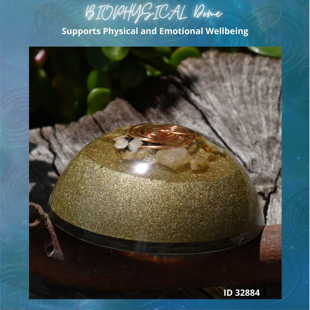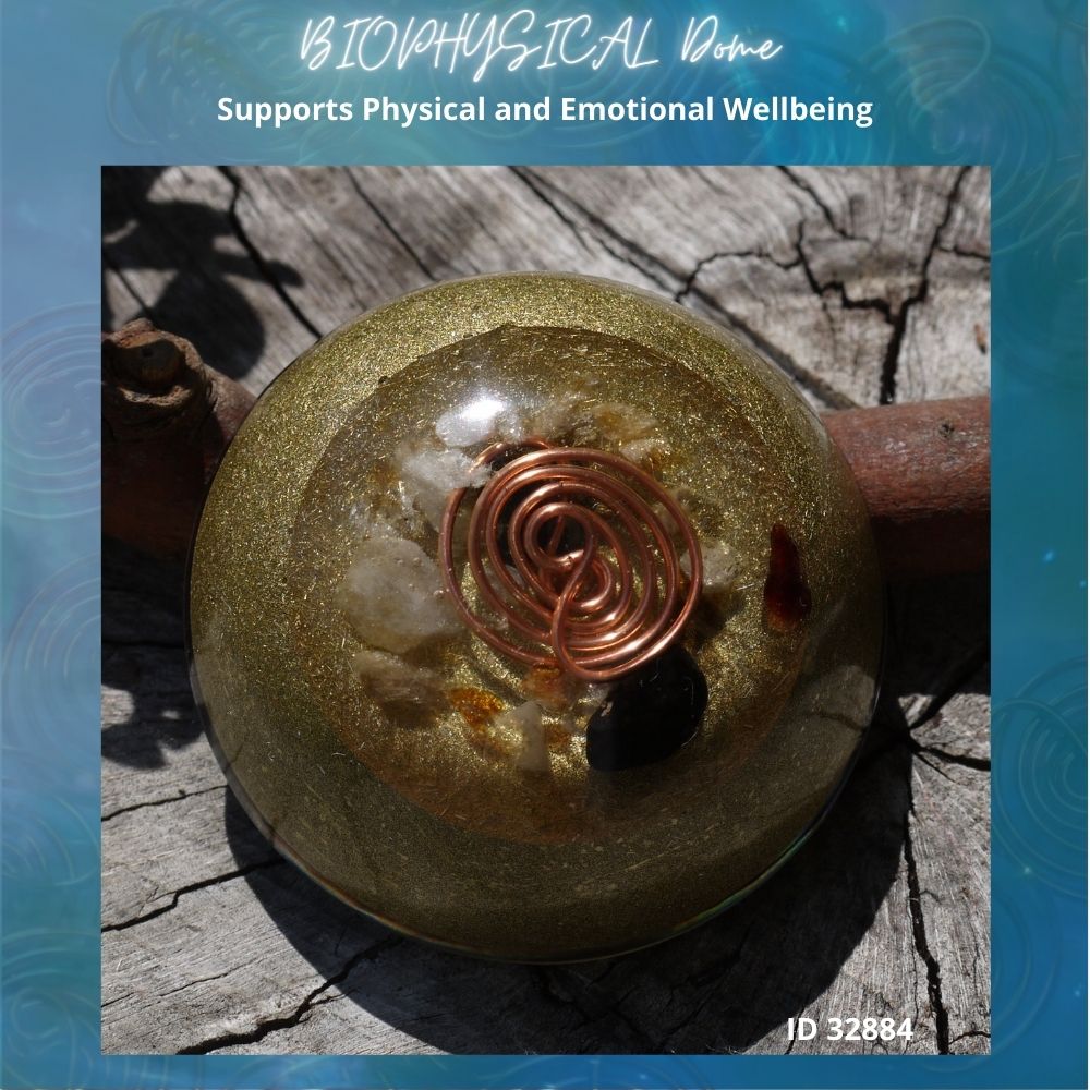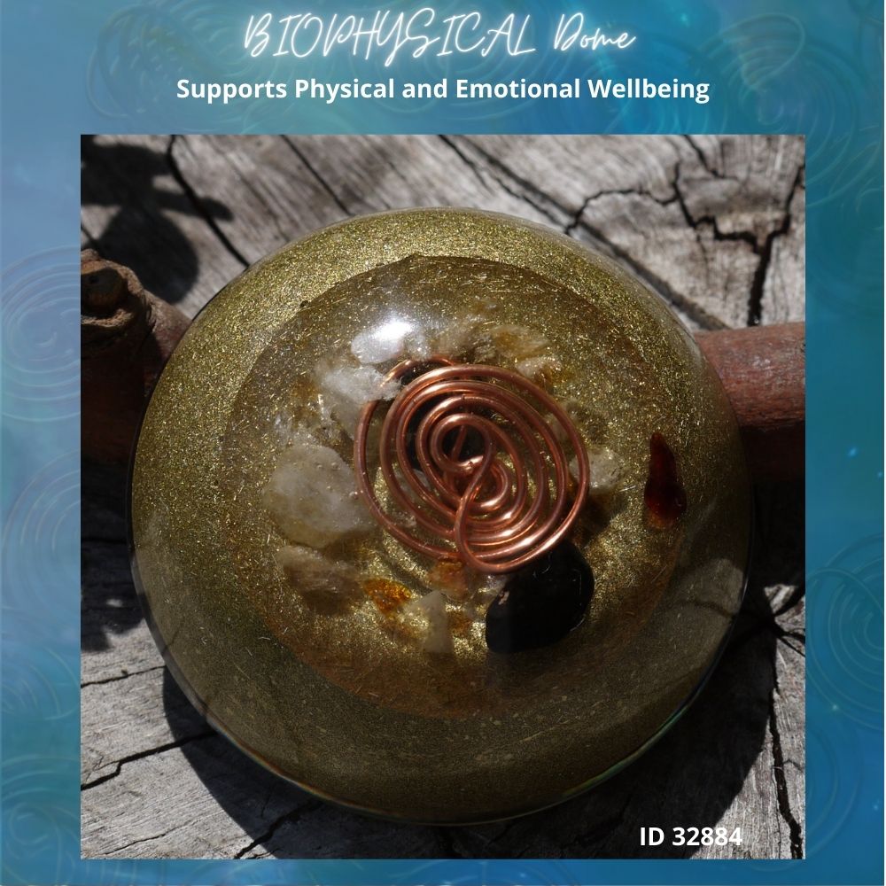 Introducing our Orgonite Biophysical Dome with special Manda Coil, a powerful harmonizing and energizing device designed to elevate your well-being and surrounding environment. Crafted with meticulous precision, this dome is constructed using clear resin infused with a carefully selected array of crystals, each chosen for its unique properties and ability to enhance your energy field. The crystals included are Kyanite, Peridot, Amethyst, Citrine, Selenite, Rose Quartz, Clear Quartz, Smokey Quartz, Garnet, Labradorite, and Jet. These crystals synergistically work together to promote balance, healing, and positivity.