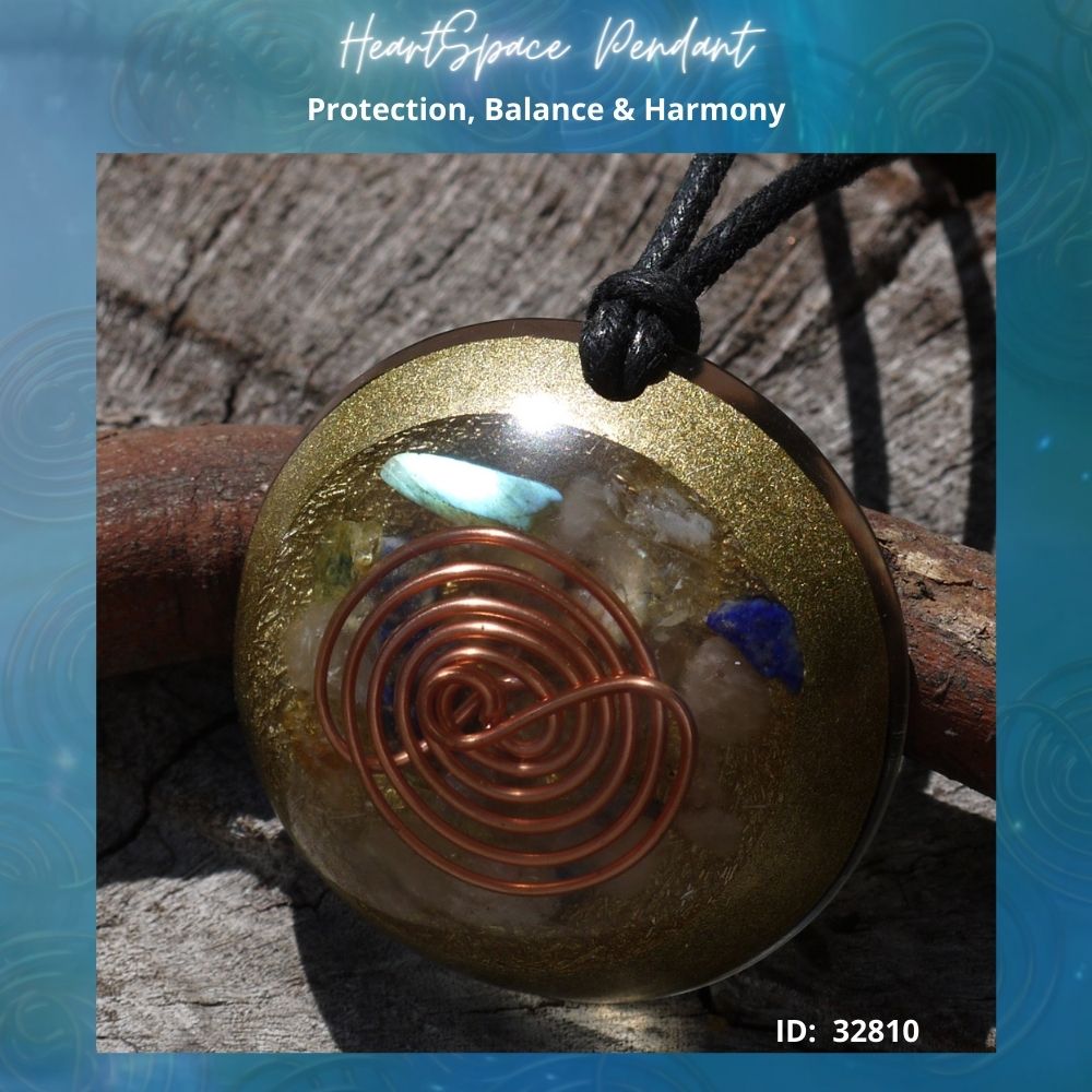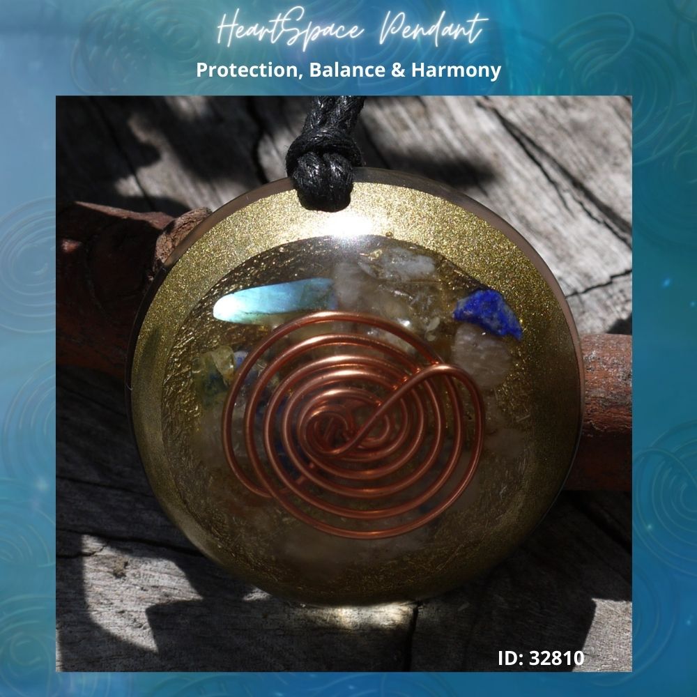 Introducing our exquisite Orgonite Heartspace Pendant variation, uniquely crafted with the powerful A Manda Coil on its surface. Each pendant is a masterpiece, resonating with its own distinct personality and energy, much like you. Our specialized Orgonite matrix, meticulously developed by Amanda, aims to fortify and strengthen your Auric Field, creating a harmonious balance within your being. The heartspace A Manda Coil, encased in clear resin, holds a sacred combination of crystals, including Kyanite, Peridot, Amethyst, Citrine, Selenite, Rose Quartz, Clear Quartz, Smokey Quartz, Garnet, Labradorite, and Jet, each carefully chosen for their exceptional properties.