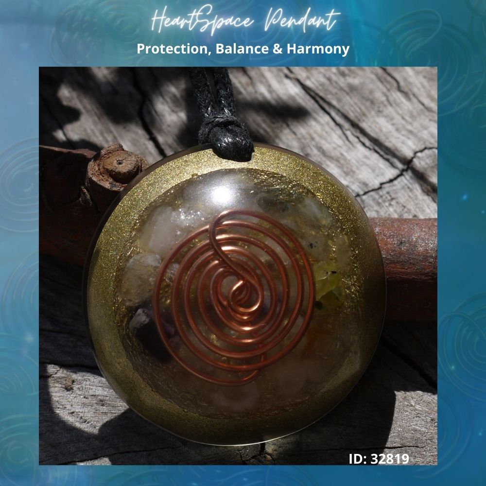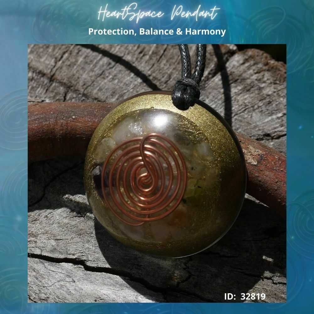 Introducing our exquisite Orgonite Heartspace Pendant variation, uniquely crafted with the powerful A Manda Coil on its surface. Each pendant is a masterpiece, resonating with its own distinct personality and energy, much like you. Our specialized Orgonite matrix, meticulously developed by Amanda, aims to fortify and strengthen your Auric Field, creating a harmonious balance within your being. The heartspace A Manda Coil, encased in clear resin, holds a sacred combination of crystals, including Kyanite, Peridot, Amethyst, Citrine, Selenite, Rose Quartz, Clear Quartz, Smokey Quartz, Garnet, Labradorite, and Jet, each carefully chosen for their exceptional properties.